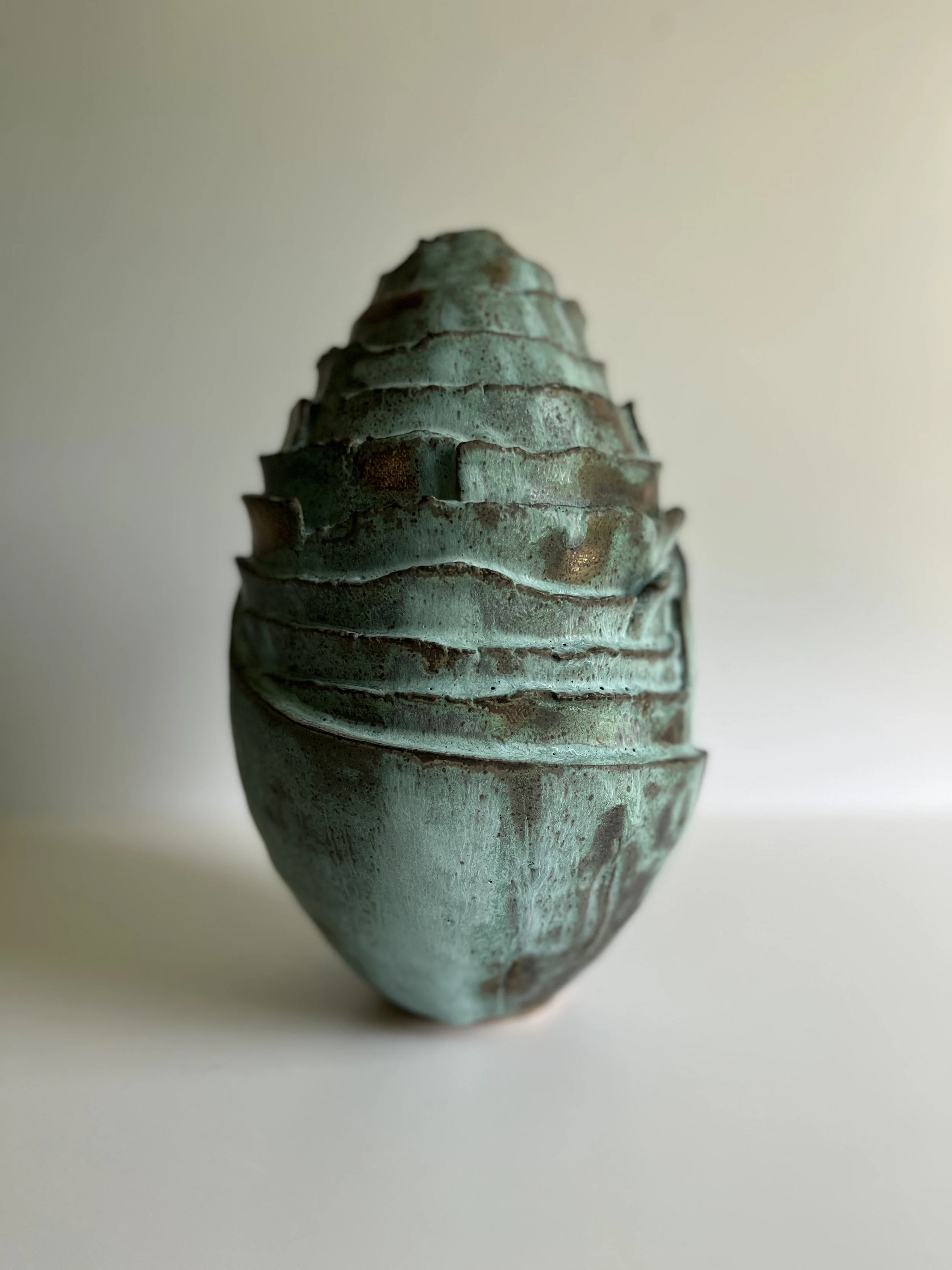 Vessel modeled after a young pinecone and screen print using pine needles.