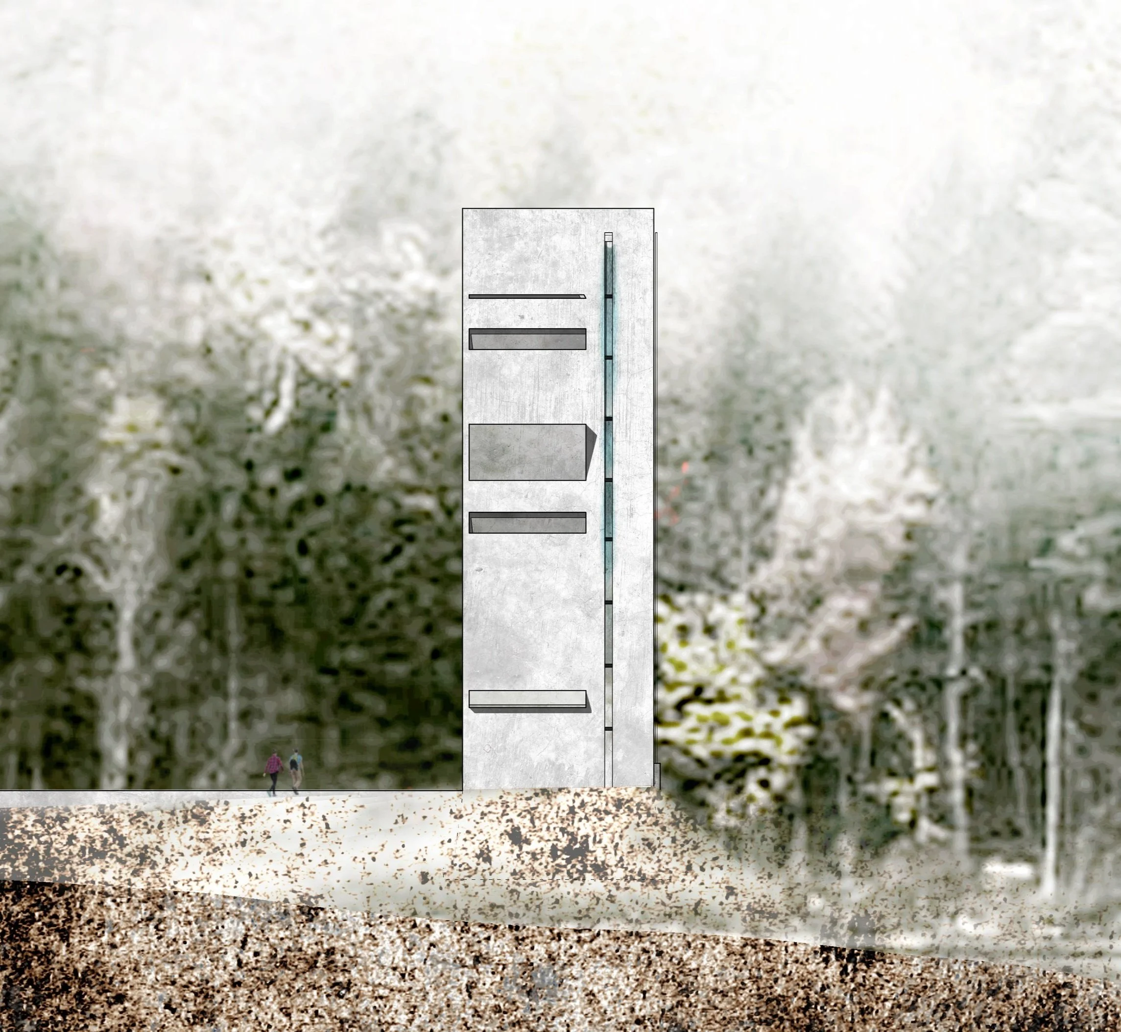 This detail—the expression of weathering and time due to materiality and construction—was used in the design of the observation tower. Small trenches were inscribed into the floors at each level to direct water out at a vertical slot along the front of the structure. The trenches, lined with copper, would encourage its oxidation to be deposited down the face of the tower, aggregating and changing over time.