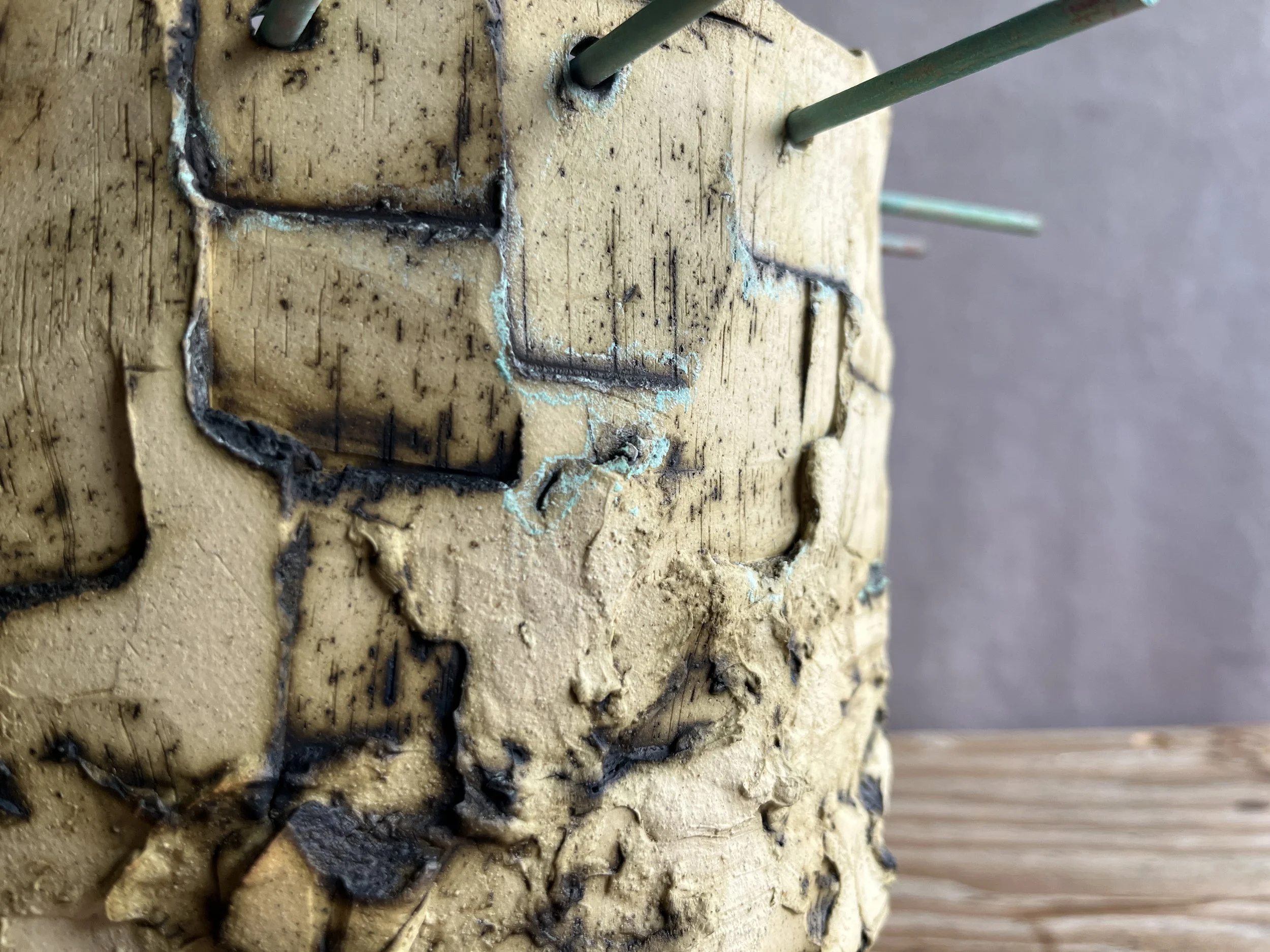 A detail pulled directly from the dam’s construction was its contraction joints between the different pours of concrete lifts. The joints were filled with a copper strip and grout at the horizontal joints. This created a series of horizontal bands where minerals and oxidation were deposited over the years.